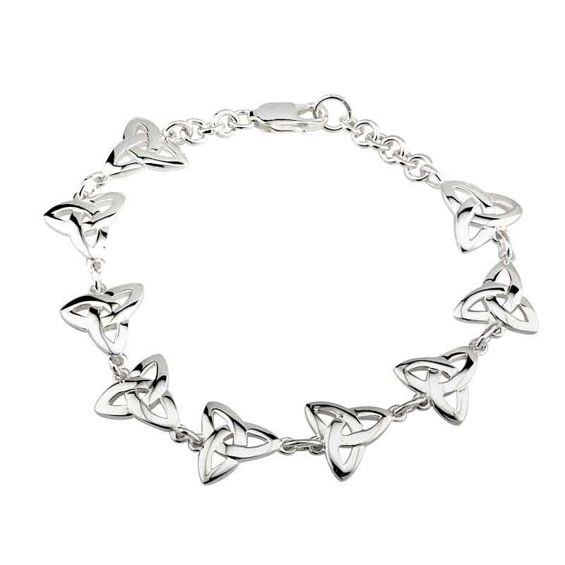 Celtic bracelet in sterling silver. This alluring celtic bracelet features 9 trinity knot charms lined together to form an intricate piece of wristwear. This Irish bracelet is made by Solvar jewelry, Dublin, Ireland. Hallmarked at the Assay office in Dublin castle.