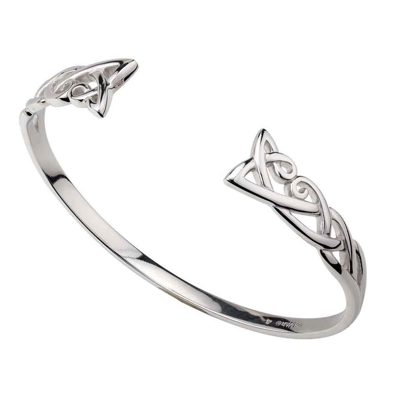 This superb celtic bracelet features poetic medley of intertwining Celtic knots in an elegantly simple torc bangle. This Irish bracelet measures 2.25 inch wide. Comes in a presentation gift box