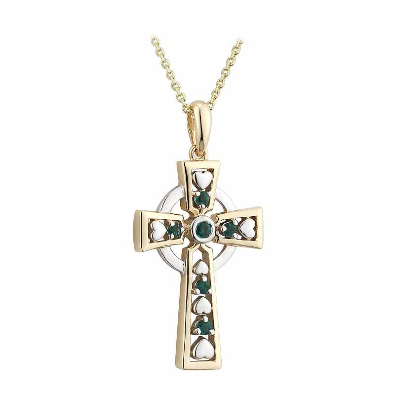 Designed by Irish artisans this 14k gold Celtic Cross Necklace has a unique design. Beautifully inlaid with Emeralds and tiny hearts a symbol of love. Made by Solvar Jewelry, Dublin, Ireland and hallmarked at the Assay office in Dublin Castle