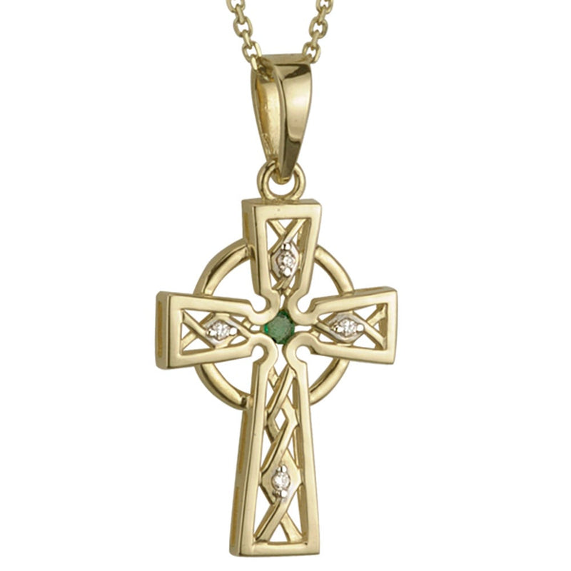 14k gold Celtic Cross pendant with 4 real diamonds and an emerald center. This pleasing irish necklace comes with 18 inch gold chain included.