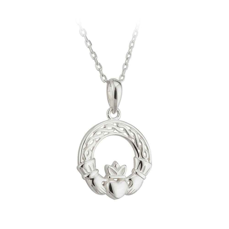 Celtic pendant with claddagh in sterling silver. An ever popular irish necklace, this claddagh is enhanced with a beautiful celtic knotwork pattern. Measures approx 0.59 inches in diameter, comes with 18 inch chain.