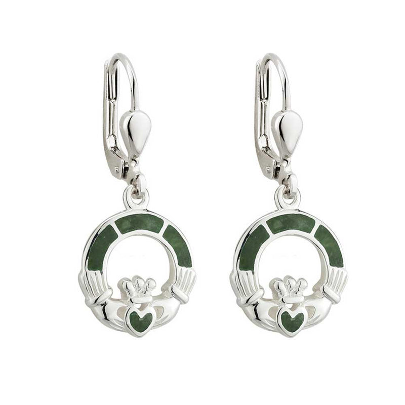 A traditional Claddagh Earring in sterling silver combining the beloved Claddagh with ancient Connemara Marble creating a stunning effect.