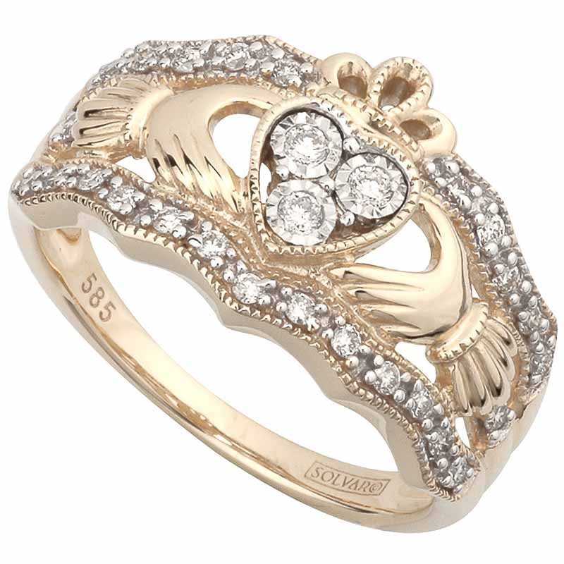 Claddagh Ring - 14k Yellow Gold Diamond Ladies Irish Claddagh Band