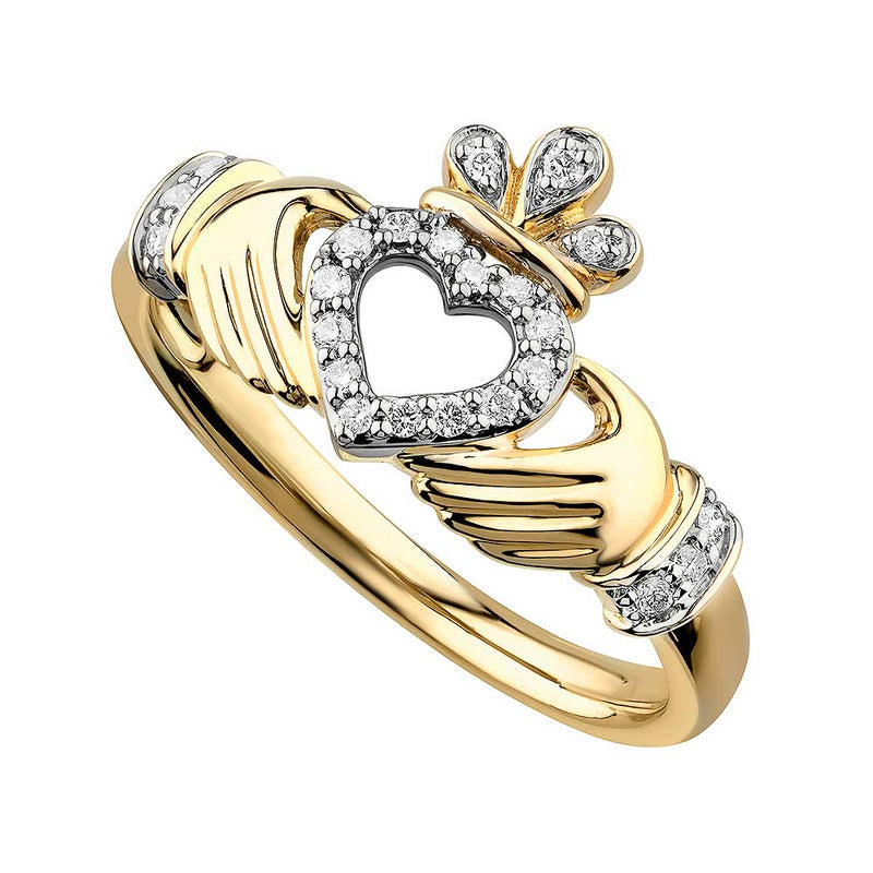 This sumptuous Claddagh Ring says it all. Its traditional Irish Claddagh featuring the Heart, which symbolizes love, Hands of Friendship and the Crown which represents Loyalty. Diamonds show how precious their love is to you and this ring has 22 in all, totaling .15ct