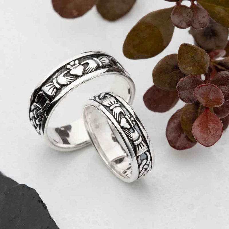 Ladies sterling silver Claddagh Ring and Irish Wedding Band with a Claddagh and Celtic knot design all-around the band. Sizes 5-10 (whole sizes only). Made in Dublin, Ireland by Solvar and hallmarked by the Assay Office in Dublin Castle.