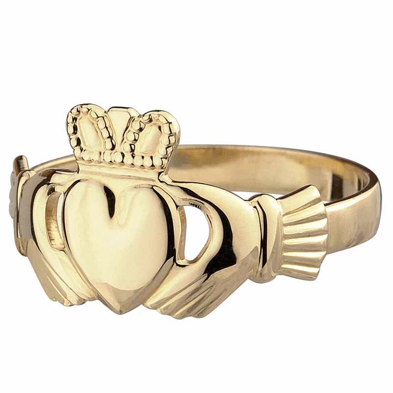 A men's 10k gold heavy weight Claddagh Ring is a Celtic jewelry favorite. Made in Dublin, Ireland by Solvar and hallmarked by the Assay Office in Dublin Castle. Sizes 9-13 (including half sizes).