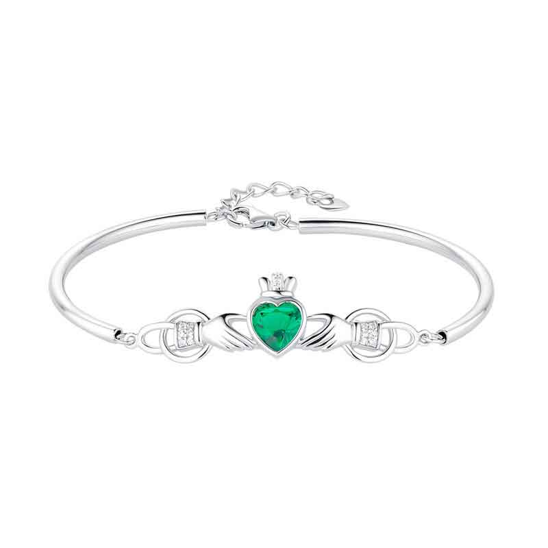 Irish Bracelet | Sterling Silver Green Crystal Heart Claddagh Bangle