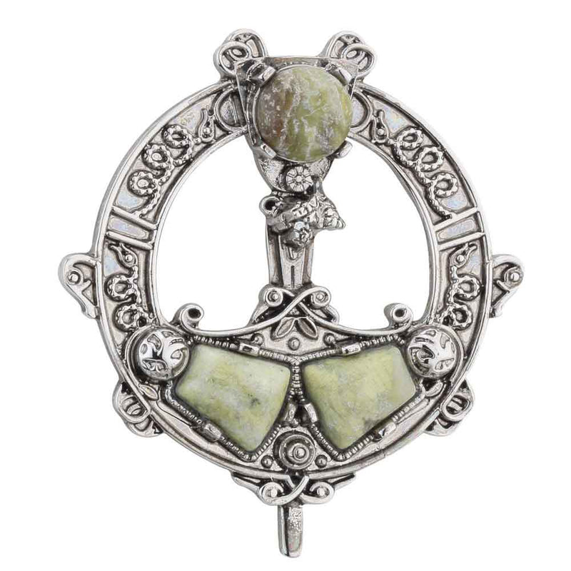 A pewter-style Irish brooch with intricate Celtic artwork & panels of Connemara Marble. Based on the famous Tara Brooch. Measures approx. 2 inches tall and wide. Comes in a presentation gift box.