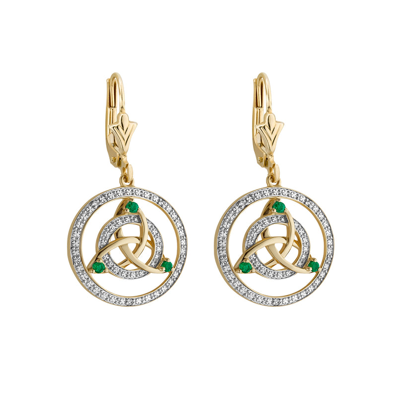 Irish Earrings | 14k Gold Diamond and Emerald Round Drop Celtic Knot Earrings
