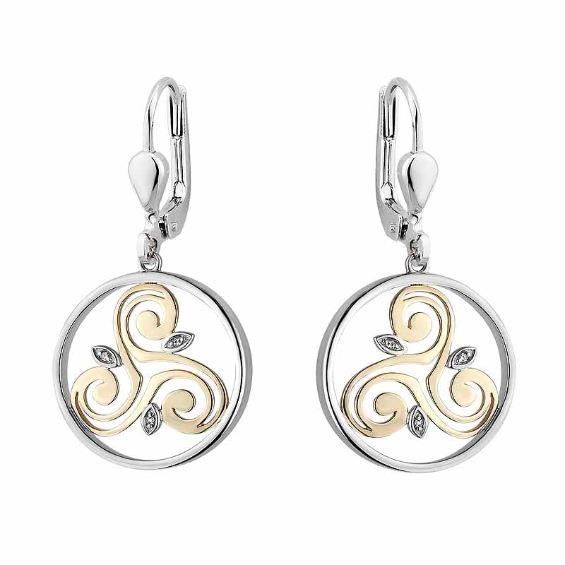 Diamonds light up these exquisite Irish drop earrings. A 10k Gold Celtic Triskele sits at the heart of a Sterling Silver circle. This ancient symbol dates back at least 5000 years and can be found at the famous Newgrange site in County Meath. It is believed to symbolize energy, but numerous other meanings have been attached to it. Past-Present-Future, Birth-Life-Death or even the 3 Celtic worlds. No doubt these earrings filled with meaning and the very best of Irish design.