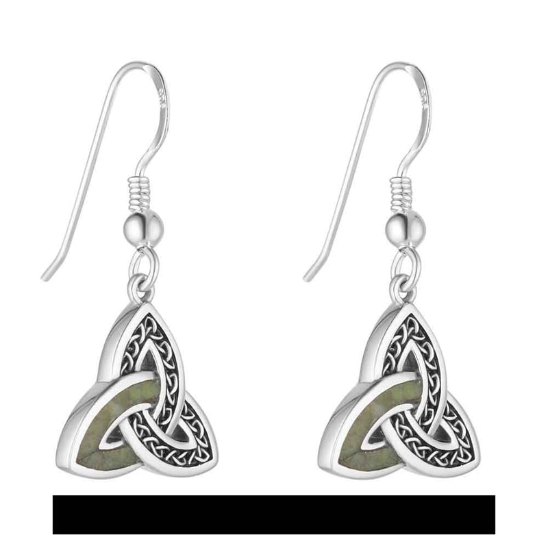A pair of sterling silver Connemara marble Trinity Knot that bring a touch of Irish elegance to any outfit. Accessorize in style, and make every look unique with the accent of Connemara marble that adorns these drop earrings. No two pieces are exactly alike, making them as individual as you are. The Trinity Knot itself is inlaid with a flowing Celtic knot design, emphasizing your enduring ties to your Irish heritage. This iconic knot symbolizes enduring Love, Faith and Friendship through its single unbroken strand. A timeless emblem of Celtic romance.