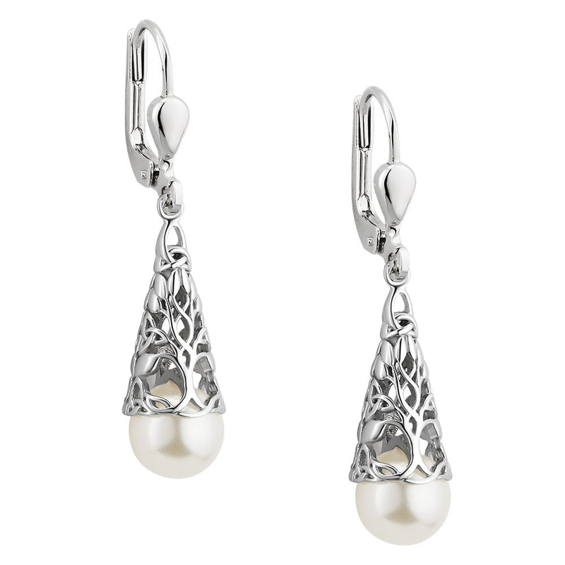 These alluring Irish Earrings in Sterling Silver feature the Trinity Knot within the branches of the Celtic Tree of Life pattern which surrounds the entire charming cone design. A glass pearl is suspended at the bottom of these beautiful drop earrings.