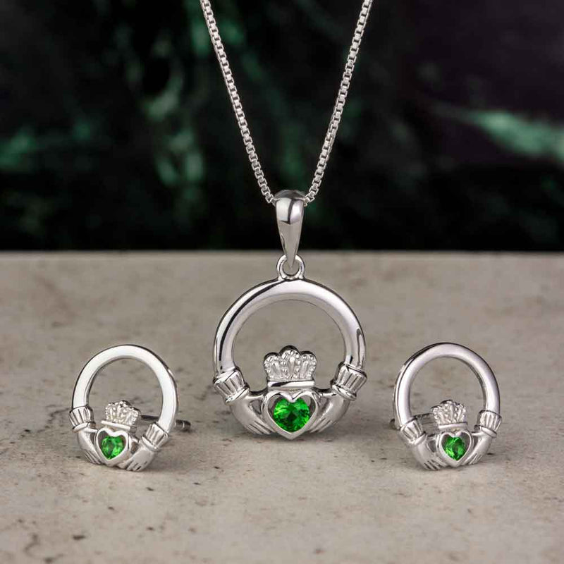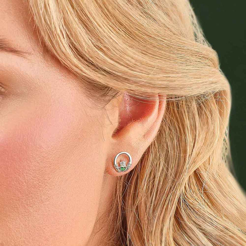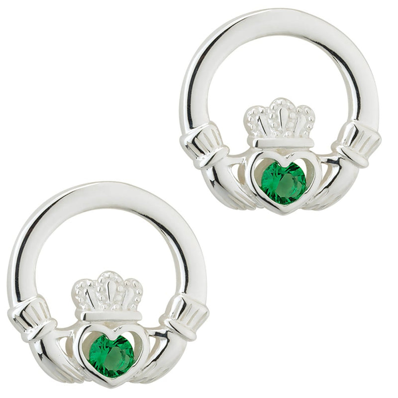 Irish Earrings - Sterling Silver Green Crystal Stud Claddagh Earrings