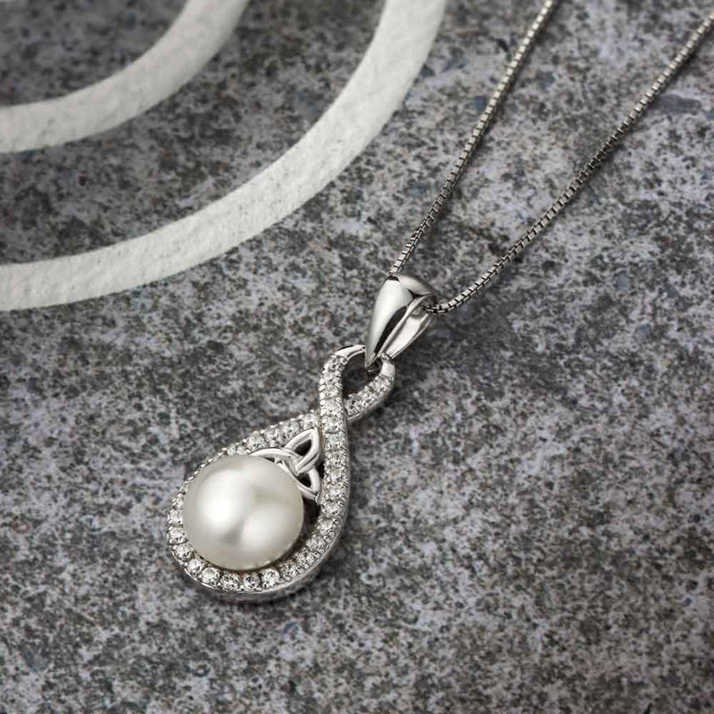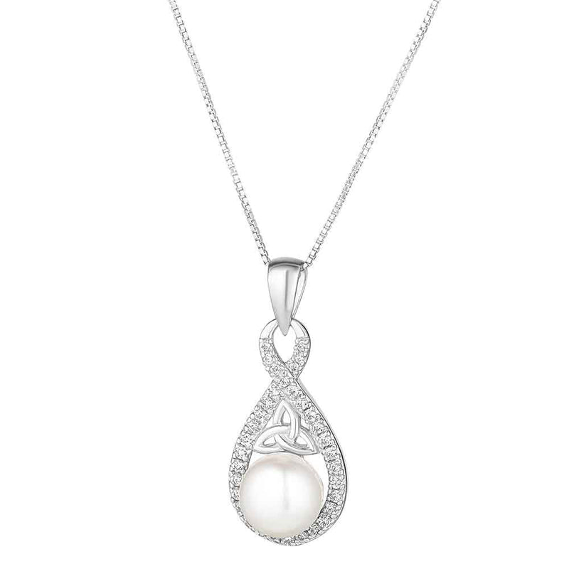 Irish Necklace | Sterling Silver Twisted Crystal Trinity Knot Pearl Pendant