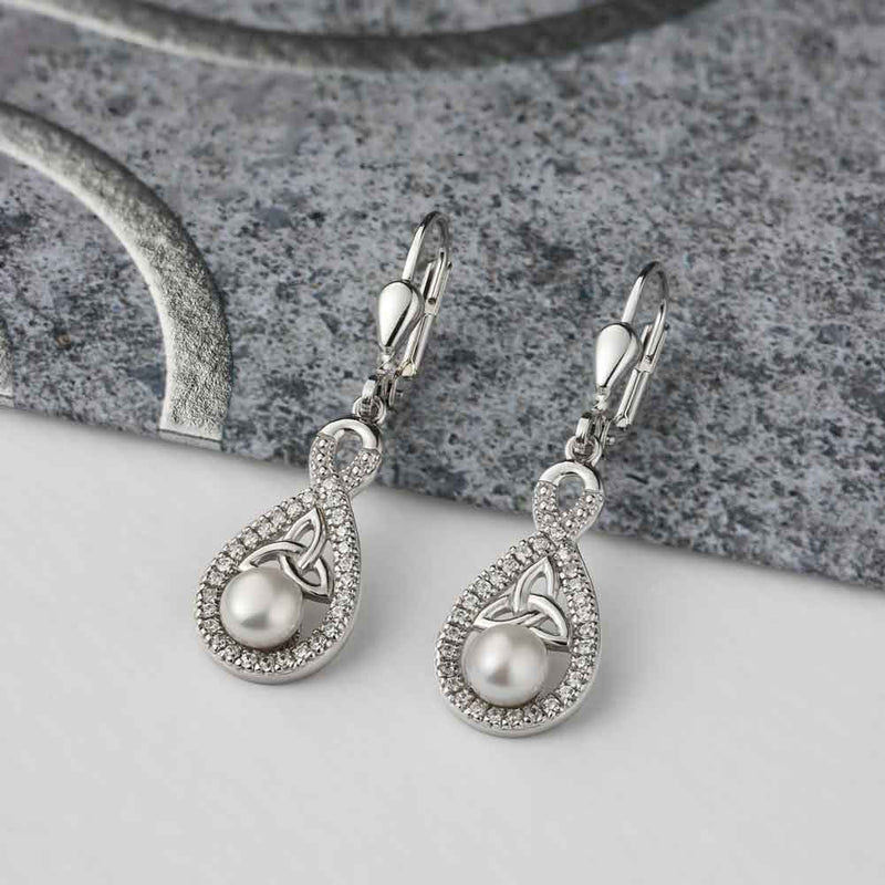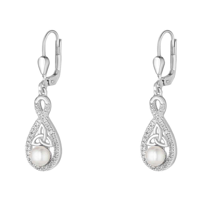 Irish Earrings | Sterling Silver Twisted Crystal Trinity Knot Pearl Earrings