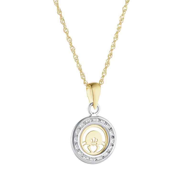 This Claddagh necklace encapsulates an Irish icon in two tones gold. Elegantly contrasting a 10k White Gold circle with the 10k Yellow Gold at its center. This cut-out Claddagh is a sleek, modern take on this Irish classic, and still retains the sentiments of this meaningful symbol. Love, Loyalty and Friendship are represented by the Heart, Crown and Hands, making this a piece for any occasion. It is completed by an array of sparkling crystals which surround the Claddagh adding light and movement to this exceptional design.