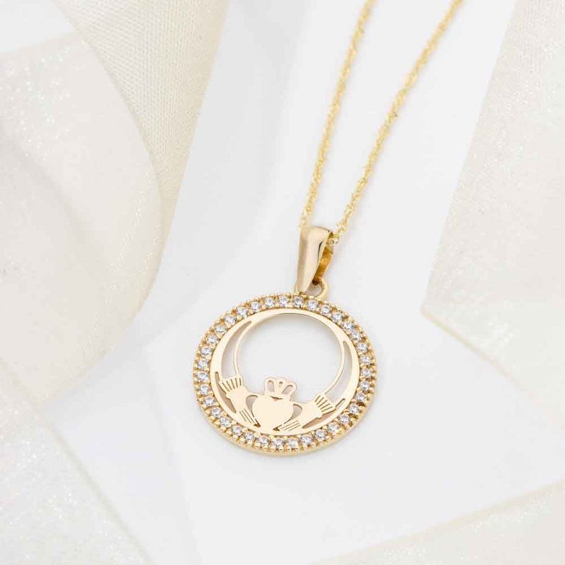 Irish Necklace | 10k Yellow Gold CZ Circle Claddagh Pendant