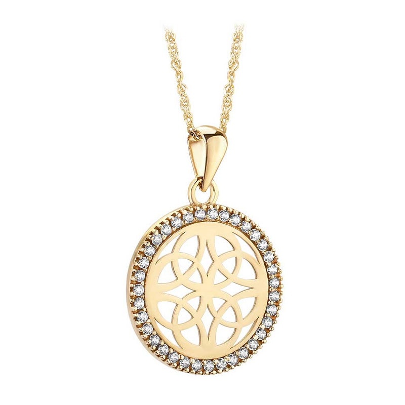 A dazzling Irish Necklace that sparkles with Cubic Zirconia and glistens with 10k Yellow Gold. At its heart is the meaningful Celtic Knot, made up of four interconnected Trinity Knots. This ancient Irish symbol has no beginning and no end. Its representation of enduring Faith, Friendship and Love is as popular as ever today, and compliments the meaning of the circle, which is encrusted with a halo of stones that allow the light to dance across this remarkable design.