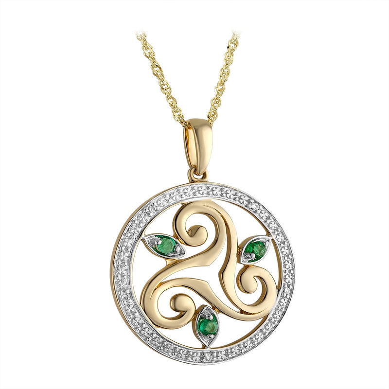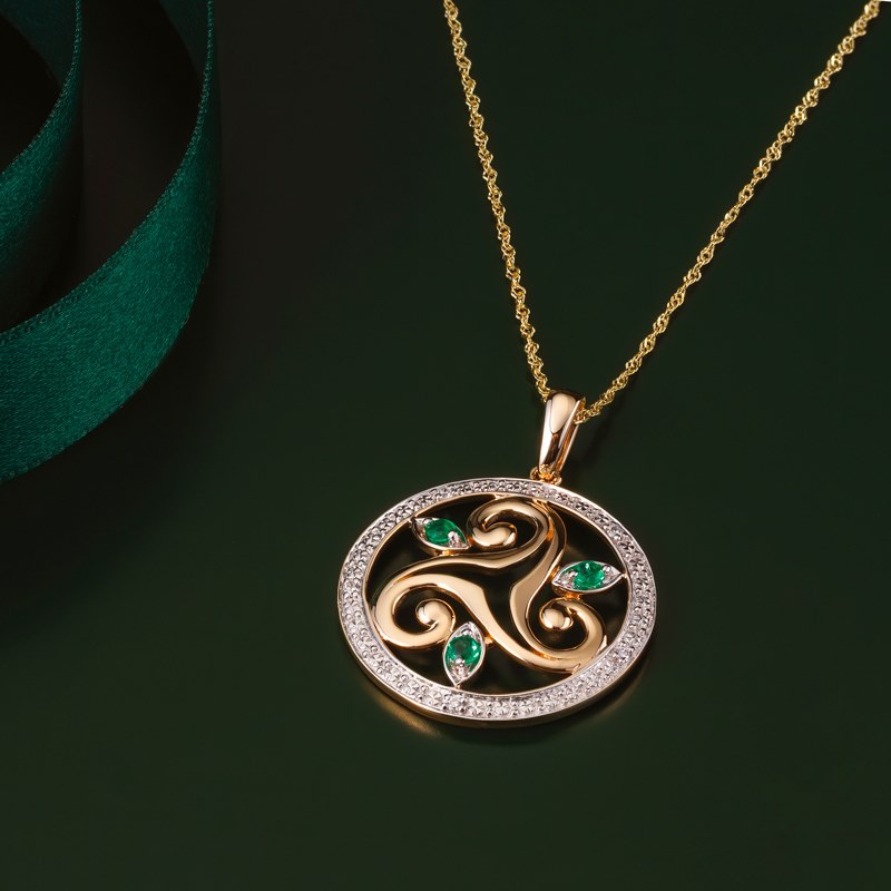Irish Necklace | 14k Gold Diamond and Emerald Circle Celtic Triskele Pendant