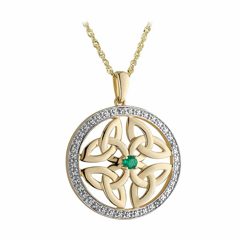 This remarkable Irish Necklace is full of Celtic charm and elegance. A gorgeous symbol of an enduring love of all things Irish, the round 14k Yellow gold pendant sparkles with dainty diamonds, and a circle of tiny shamrocks. Within, four Trinity Knots form a Celtic Knot with a genuine emerald at its center, evoking the green fields of Ireland's countryside. The Trinity Knot is intertwined so it has no beginning and no end, symbolizing an enduring love, that lasts forever. This stunning, sophisticated piece of Irish jewelry is an ideal way to show your eternal love in style.