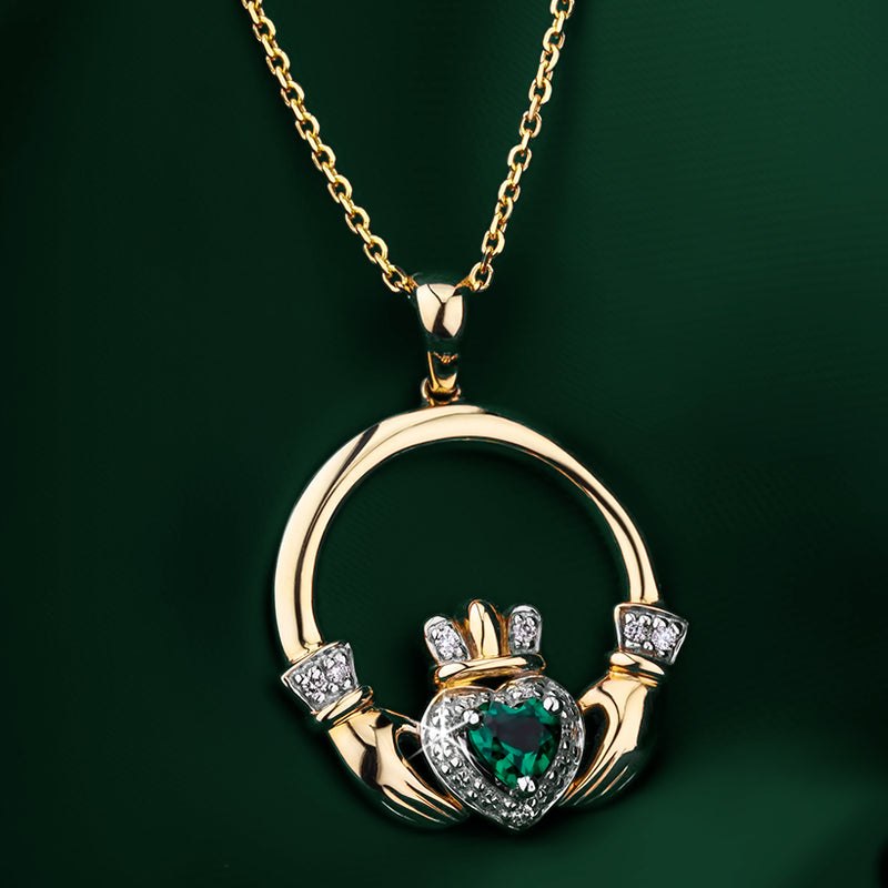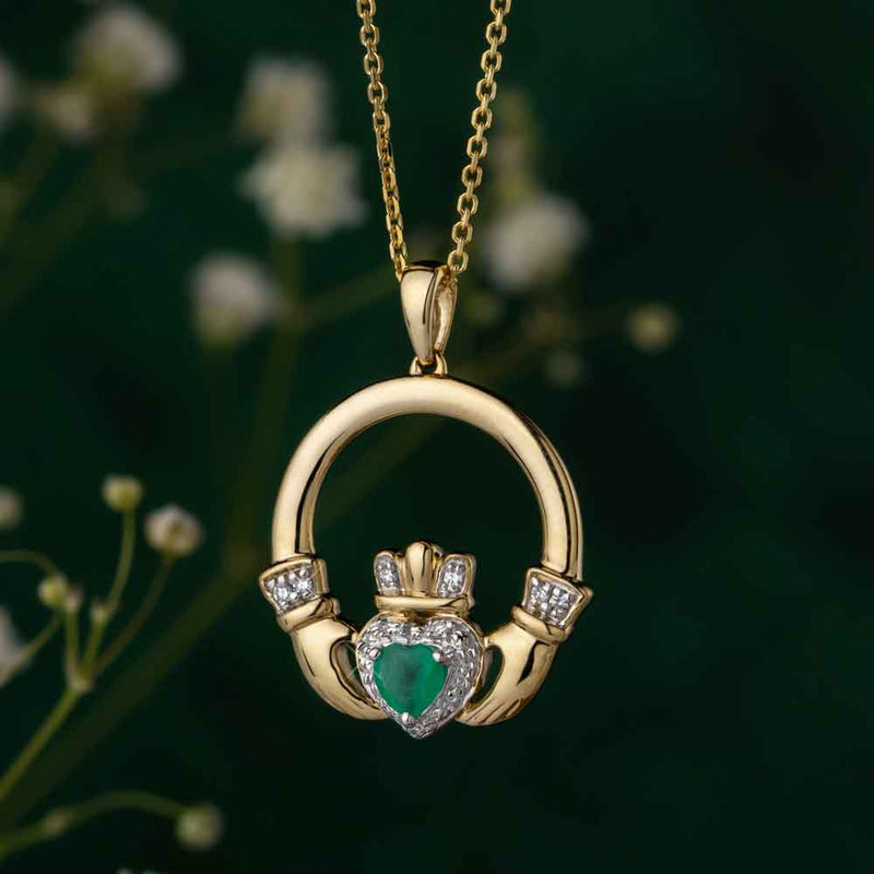Irish Necklace | 14k Gold Diamond & Emerald Claddagh Pendant