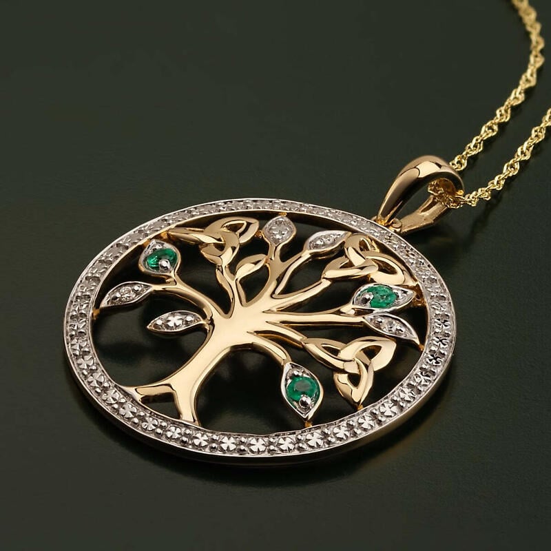 Irish Necklace - 14k Gold with Diamonds and Emeralds Tree of Life Pendant
