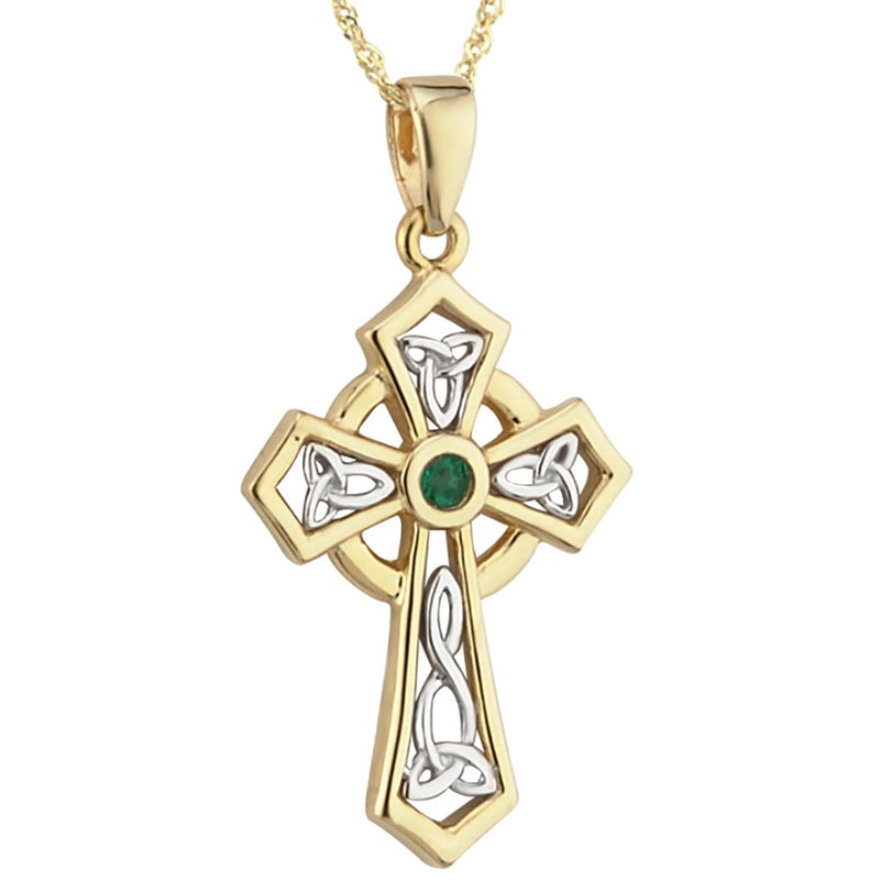 Irish Necklace | 14k Two Tone Gold Emerald Trinity Knot Celtic Cross Pendant