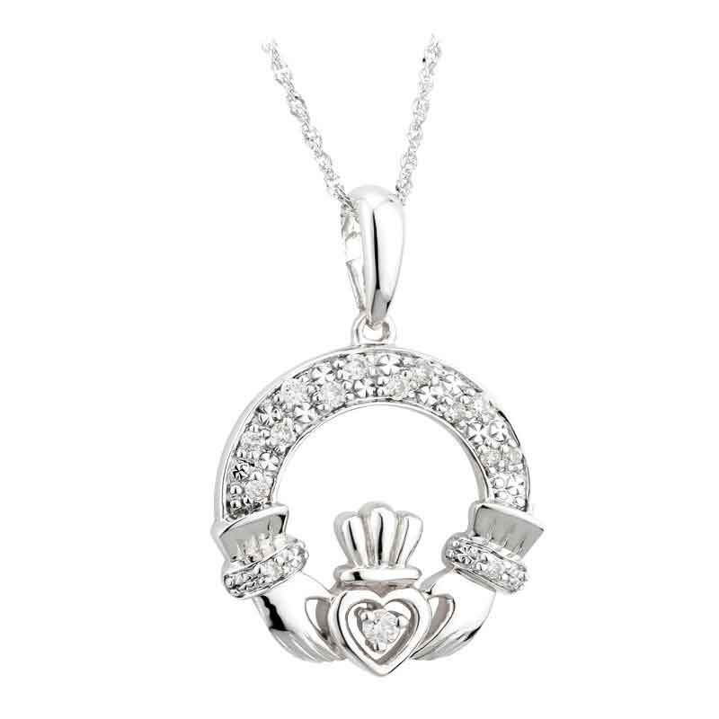 This elegant Claddagh Pendant in brilliant 14k white gold sparkles with diamonds which highlight the key features of this iconic Irish necklace. The crown reprsents loyalty, the hands friendship and the heart naturally symbolizes love. Hidden four leaf clovers in amongst the diamonds will add the luck of the Irish to this amazing piece of Irish Jewelry.