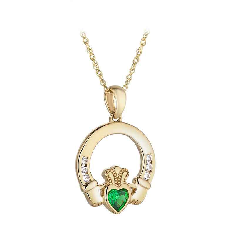 Irish Necklace | 9k Gold Green Crystal Heart Claddagh Pendant