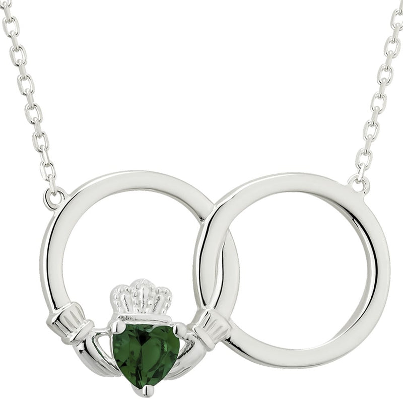 An Irish Necklace in sterling silver featuring a classic Claddagh with a green crystal interlocked with a circle, sealing the virtues of this beloved Irish symbol. Love, Loyalty and Friendship is represented by the Heart, Crown and Hands. Complete the look with Irish Bracelet code: IJSV5978