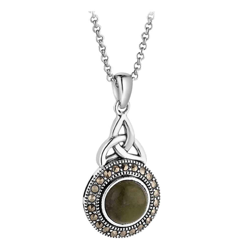 Irish Necklace | Sterling Silver Connemara Marble Marcasite Halo Trinity Knot Pendant