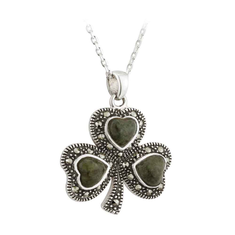 Irish Necklace - Sterling Silver Connemara Marble Marcasite Shamrock Pendant