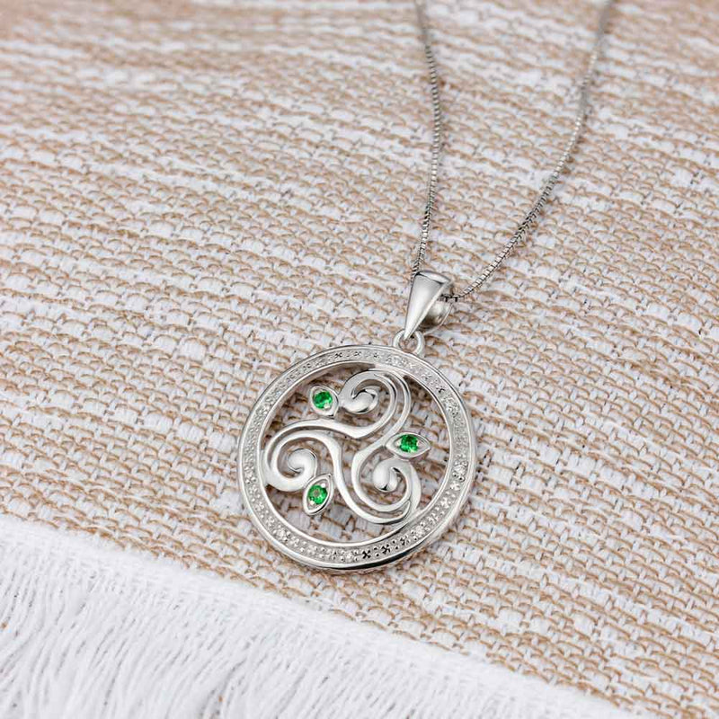 Irish Necklace | Sterling Silver Crystal Round Celtic Spiral Triskele Pendant