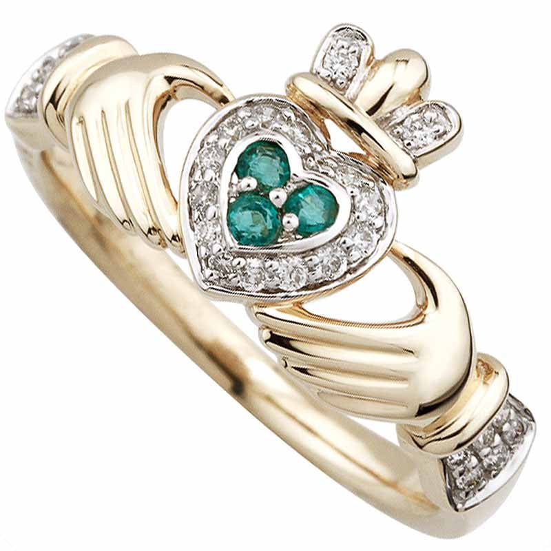Irish Ring - Ladies 14k Gold Emerald and Diamond Encrusted Claddagh Ring