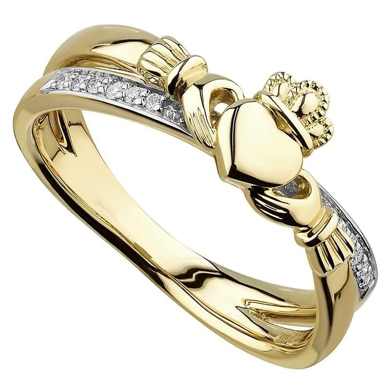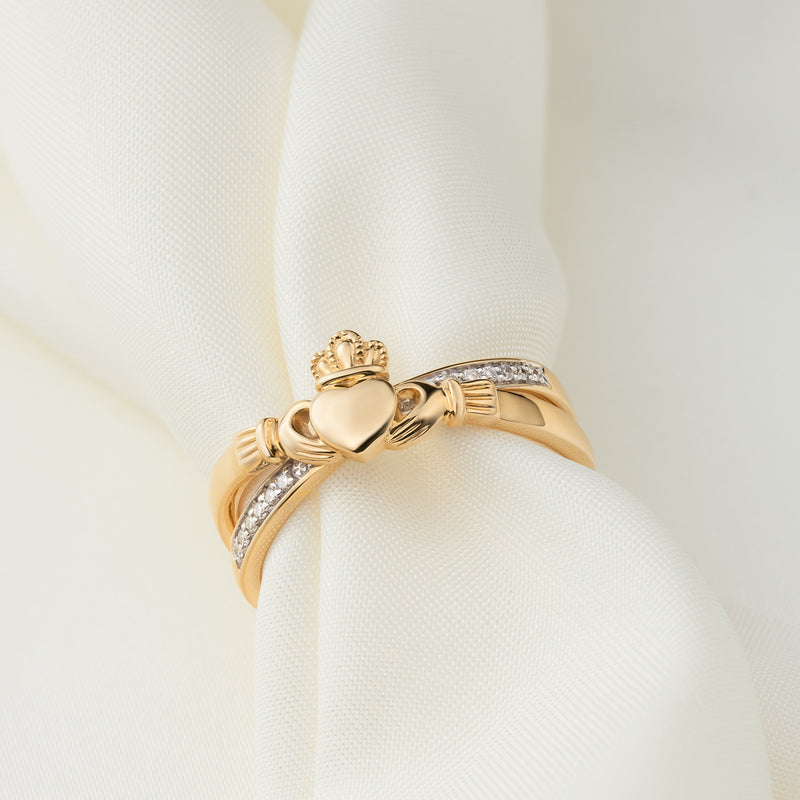 Irish Rings | 14k Gold Ladies Diamond Crossover Claddagh Ring
