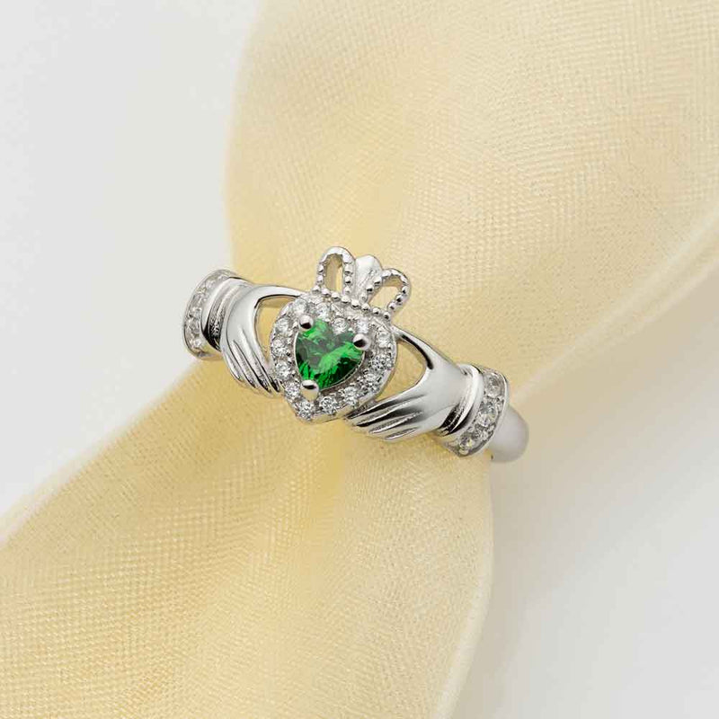 Irish Rings | Sterling Silver Ladies Green Crystal Heart Claddagh Ring