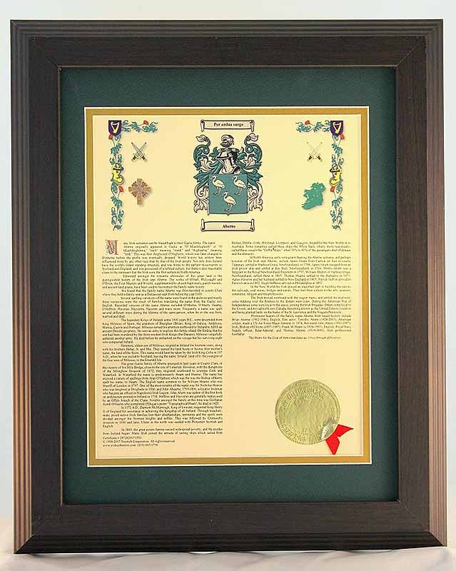 Each Coat of Arms and History Print includes 1,800 words of history which includes the ancient origin of the name, spelling variations, early movement of the surname during the Middle Ages, noteworthy bearers from the 1500-1600's, first settlers to North America, contemporary notable bearers of the name or variants, and full color rendition of the earliest coat of arms associated with the name. The print comes double matted in a gold-painted frame. Please specify name. Made in the USA. Shipped separately - please allow 2-4 weeks for delivery.