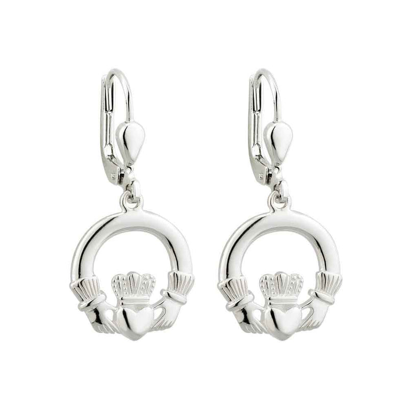 Drop earrings highlighting the famed Irish claddagh, symbol of love and friendship. Earrings: 0.5" x 0.5". Lever back fittings.