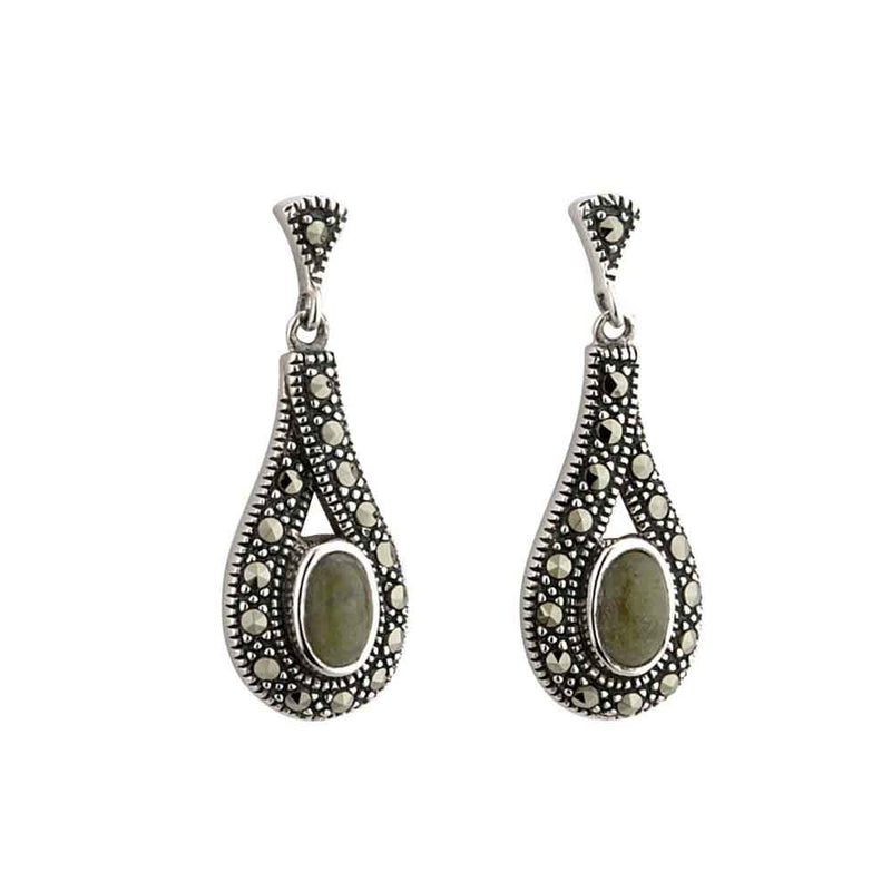 Sterling silver and Connemara marble combine with the sparkle of marcasite in these gorgeous drop earrings. Earrings: 0.75" x 0.25". Post fittings.