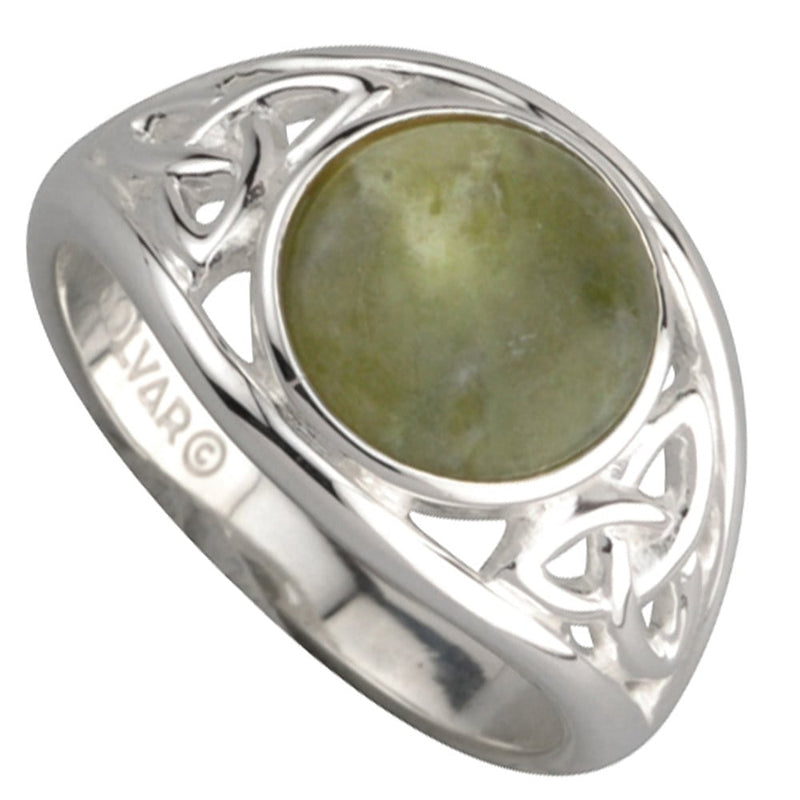 A striking sterling silver Trinity Knot Ring with genuine Connemara marble and accented with Trinity knots. Made in Dublin, Ireland by Solvar and hallmarked by the Assay Office in Dublin Castle. Sizes 5-10 (whole sizes only).
