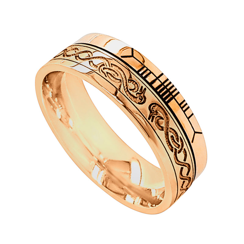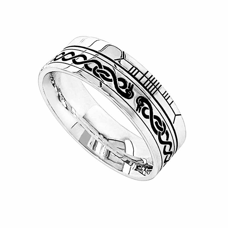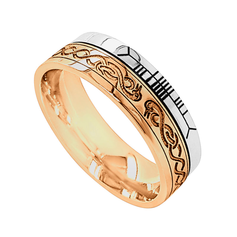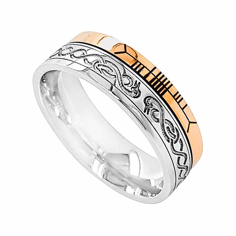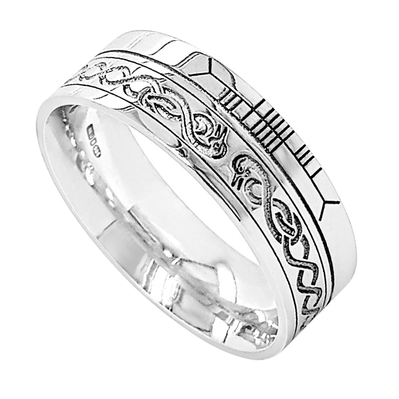Stunning Irish Ring featuring a Le Cheile design and a rail inscribed in Ogham with the word "faith". The width of the ring is 0.27 inches (7mm). Available in silver, yellow and white gold, silver and gold mix or either white or yellow gold rail, click the thumbnails beneath main image to see the different types. This ring is made to order. Please allow approx. 10-14 working days for this item to be completed. Sterling Silver Version is Oxidised as Standard. Inscribed in Ogham is the word 'Faith'. Court Shape for Comfort Fit. Made in Ireland and hallmarked by the Assay Office in Dublin Castle. One Width for both Ladies & Men's. Available Sizes 4 to 13. 18k Gold and Platinum Prices are available on request only and require further 2 weeks lead times.