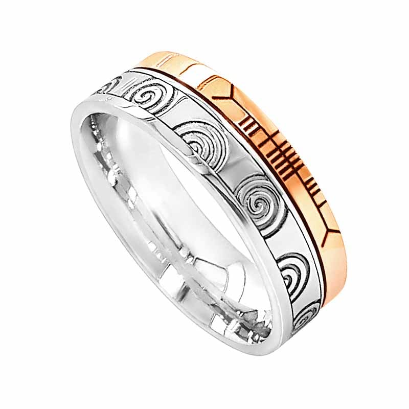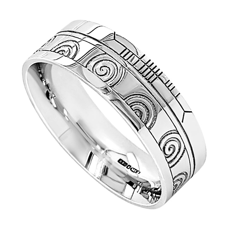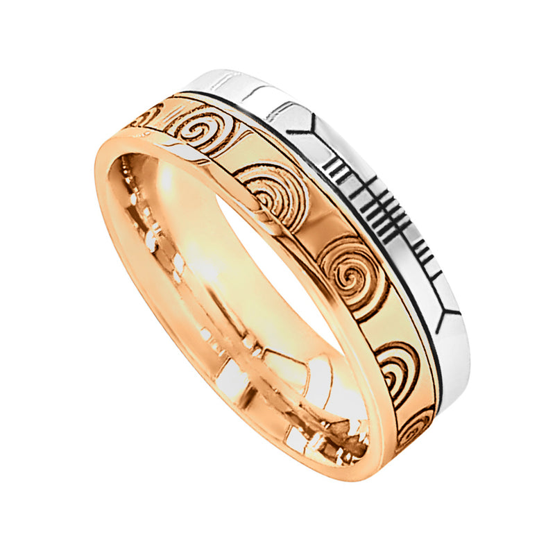 Stunning Irish Ring featuring a Newgrange design and a rail inscribed in Ogham with the word Faith. The width of the ring is 0.27 inches (7mm). Available in silver, yellow and white gold, silver and gold mix or either white or yellow gold rail, click the thumbnails beneath main image to see the different types. This ring is made to order. Please allow approx. 10-14 working days for this item to be completed. Sterling Silver Version is Oxidised as Standard. Inscribed in Ogham is the word 'Faith' Court Shape for Comfort Fit Made in Ireland and hallmarked by the Assay Office in Dublin Castle. One Width for both Ladies & Men's. Available Sizes 4 to 13. 18k Gold and Platinum Prices are available on request only and require further 2 weeks lead times.