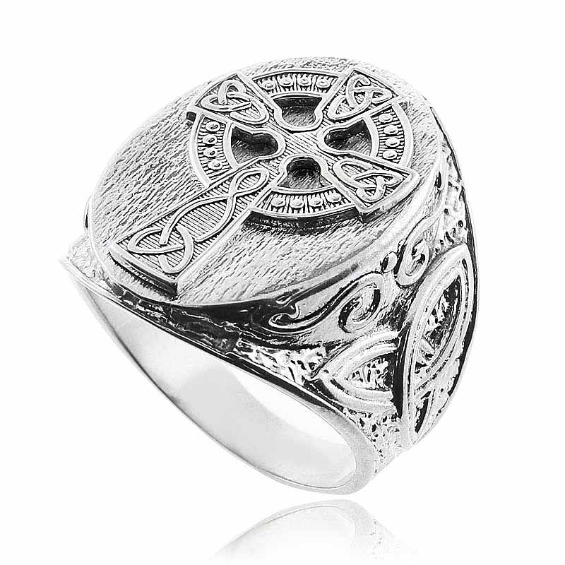 Expertly crafted from the finest sterling silver, this Celtic Ring with its wide band and large Celtic Cross face makes quite a statement. Embellished with Celtic Trinity Knots, this allergy-free silver statement ring is the perfect way to express style and faith. Made in the USA. Sizes: 4-16 (including half sizes).