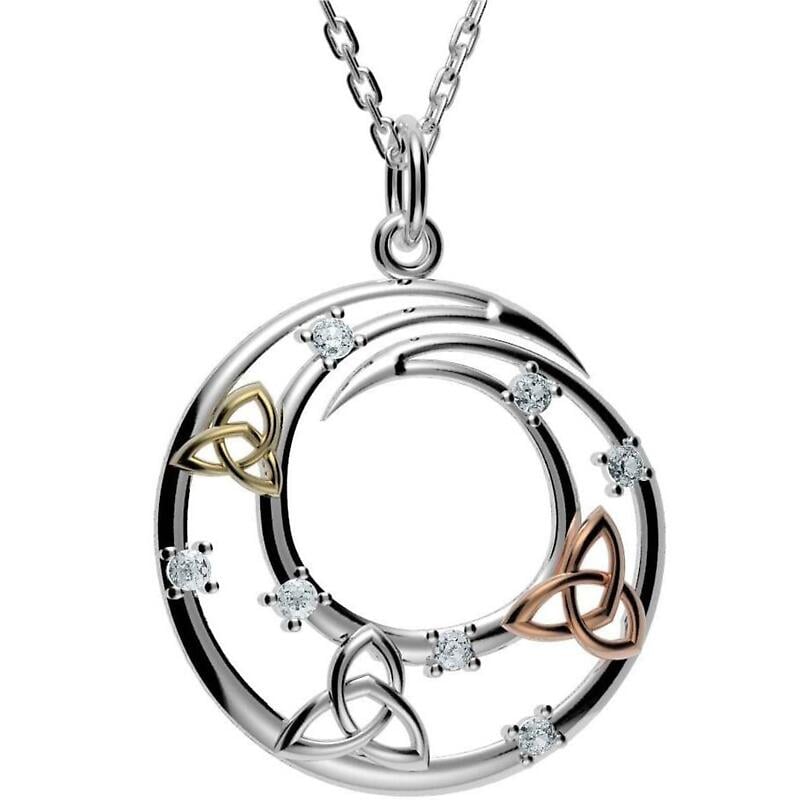 Sterling Silver Trinity Knot Pendant with 18k rose gold and 18k yellow gold plated trinity knots and accented with white CZs. Comes on an 18 inch chain. Handcrafted in Dublin, Ireland & hallmarked in the Assay Office in Dublin Castle.