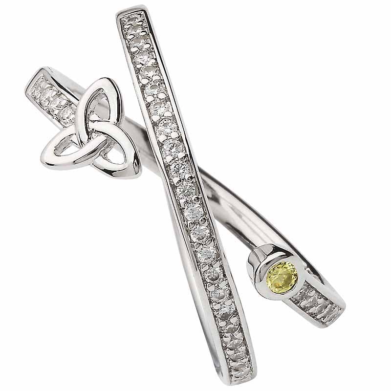 A Celtic Trinity Knot ring with a modern twist. This superb Sterling Silver ring features the Trinity Knot at one end, with a Periodot Crystal on the other, all in a contempory crossover ring style. This elegant ring is sure to be noticed, as the two bands that sparkle with clear crystals.