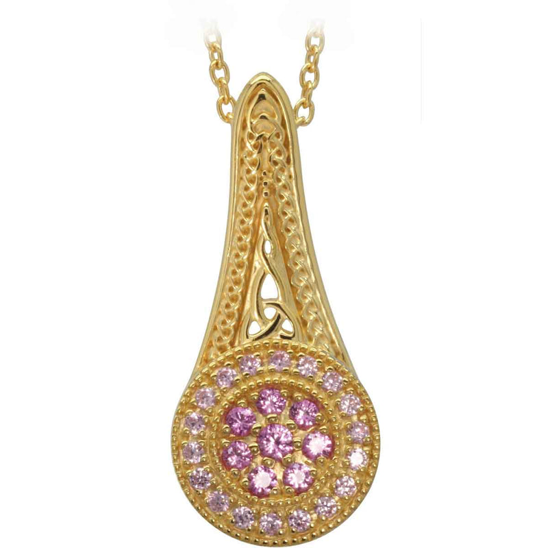 This elegant Irish necklace is made with sterling silver and plated with 18k gold. It features a pendant of dazzling crystals, in a choice of four colors Green, White, Pink and Blue. Incredibly detailed Celtic woven knotwork inspired by the artwork of the Book of Kells and the iconic Trinity Knot complete this piece. Representing everlasting Love, Faith and Friendship this Celtic symbol is one of Ireland's most meaningful and beloved emblems.