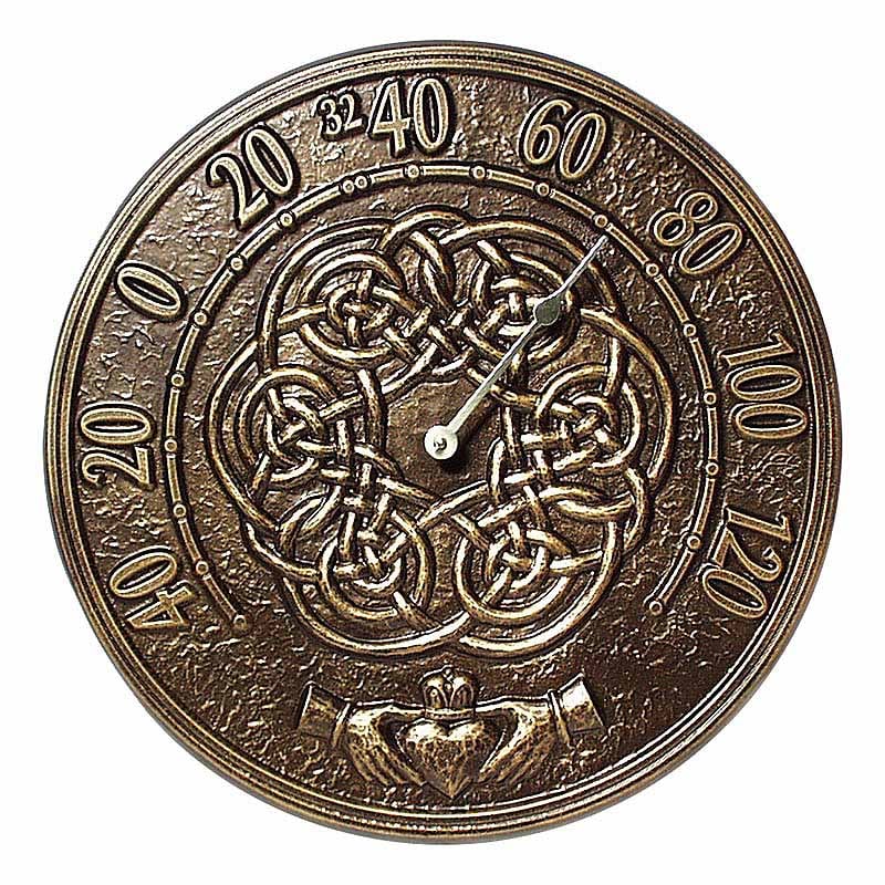 Our beautiful Irish Blessings Thermometer originates from a hand carving that is then replicated in rust-free, recycled aluminum. This durable thermometer is hand cast and tells accurate temperature from -40 to 120 degrees Fahrenheit. Finished in a weather-resistant paint. 12" diameter. Made in the USA. Shipped separately - please allow 2-3 weeks for delivery.