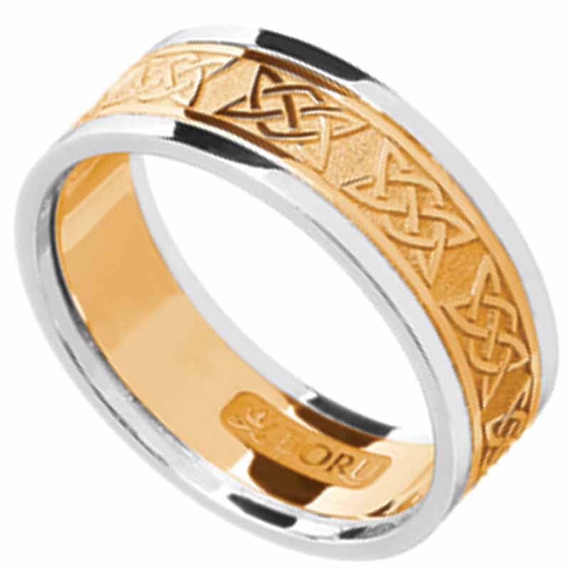 Men's yellow and white gold Irish Ring and also Irish Wedding Band is crafted with a Celtic design known as 'Lovers knot'. Wedding Band. Ring width: 0.40 inches. Sizes 9-13 (including half sizes). This ring is made to order. Please allow approximately 10-14 working days for this ring to be completed.