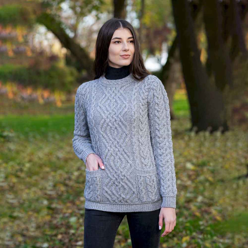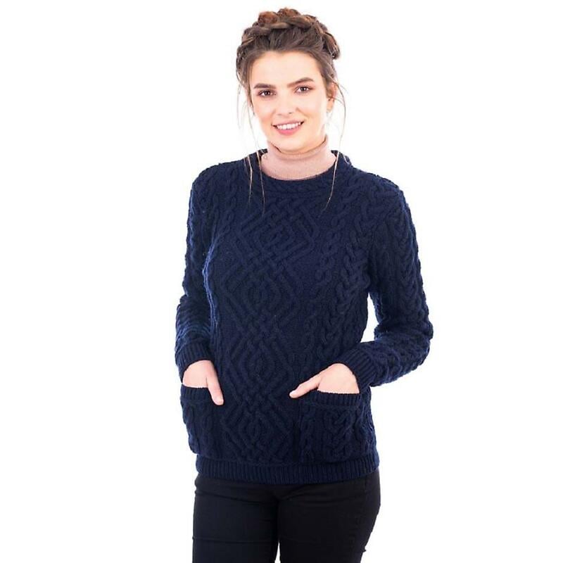 This ladies merino wool sweater is the ideal way to stay warm and stylish. Its distinctive aran knit patterns from Ireland include the classic cable. With handy pockets at the front and ribbed waist and sleeves, this is an Irish clothing design that is both practical and comfortable. Finished with a crew neck collar, any Irish lady will love.