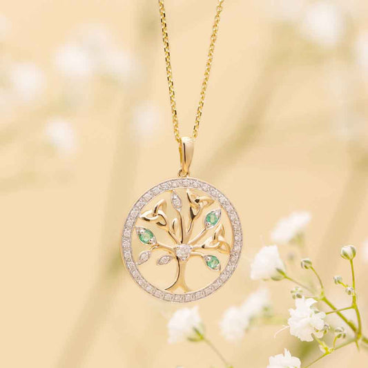 Irish Necklace | 14k Gold Diamond and Emerald Circle Celtic Tree of Life Pendant
